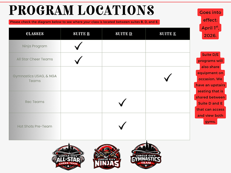 a full competition size cheer spring floor, trampoline, pit, and extra floor space. This gym has one bathroom and an upstairs mezzanine for parent viewing with tables and chairs. The gym also has a water fill station. If you need to talk with our office- please go to Suite D for any billing or office needs.